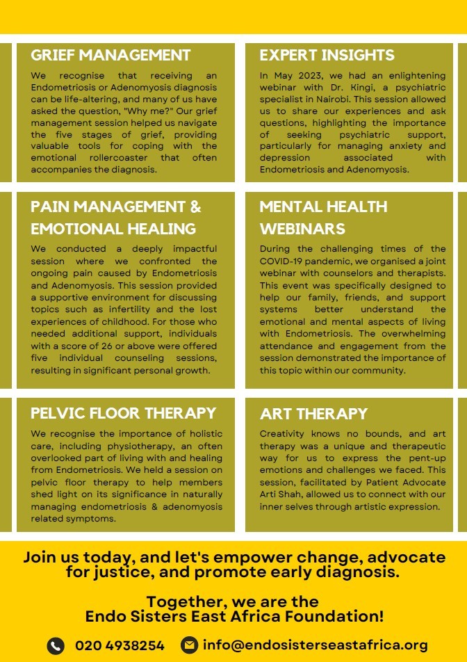 Dr Owiti is the former Vice Chairman of Endo Sisters East Africa Foundation an organization that advocates for and supports women living with Endometriosis and disseminates information on Menstrual Disorders.