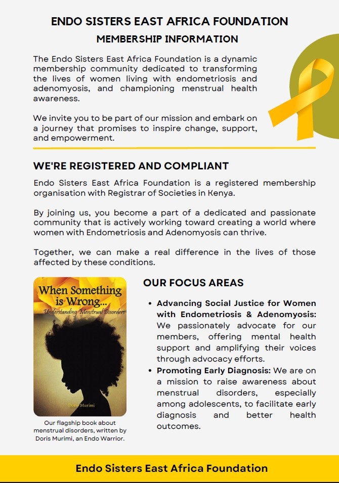 Doris Murimi is an Author, Adolescent Menstrual Health Advocate, Founder and CEO of Endo Sisters East Africa Foundation. She also serves as the Board Secretary of the Foundation and sits on the Management Committee. Ms. Murimi has a total of twenty-five years of work experience, specifically in the fields of human Security, wildlife, land & community conservation, community development, HIV and AIDS grants management, poverty & humanitarian relief and Menstrual health specializing in Endometriosis advocacy & Menstrual Related Disorders information dissemination within the NGO/development sector in both local and regional capacities. She holds an MBA, Maastricht School of Management, Netherlands, an MSc in Skills and Performance, University of Leicester, UK and a Certificate in ‘Menstruation in a Global Context: Addressing Policy and Practice’, Columbia University, USA. FCS Murimi is a Fellow of the Institute of Certified Secretaries (ICS), a member of the Institute of Human Resource Management (IHRM) and Kenya Faith Writers Network (KFWN)